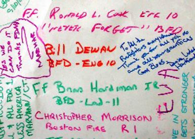 We were looking forward to our visit here. This was another big city, with a lot of FD history, and knew that there part in September 11th was also important. At this time we had not confirmed a public presentation with the banner at any particular place. We knew any FD in this town would be a big one, and full with activity. We located a FD just off the highway exit, and introduced ourselves. They were very interested in signing the banner, and speaking with us about 9/11. They then called Headquarters to tell them about us, and to welcome us over there.