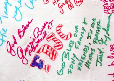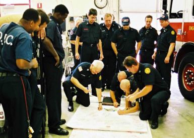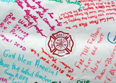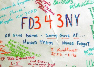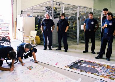 The banner had grown to be 9 sections by now, and with the help of the firefighters we set all out inside the truck bay. We also initiated the 10th section of the banner. Mr. Cala had shown us around the large facility, and explained to us what it was like to be here on 9/11. He also escorted us with the banner to several other FD’s in the area. We met many firefighters here who were there on the morning of September 11th. The telling of their personal accounts was very emotional, and moving to hear.
