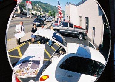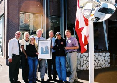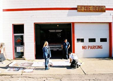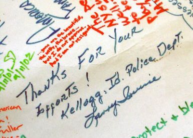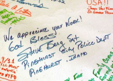 We awoke early with the sunrise. We discovered a very quaint town, and friendly FD to visit. The Fire Chief was there making coffee, and invited us in. After some conversation, we unrolled the banner out front. He then walked next door to ask the newspaper to come over. I didn’t think the impact of 9/11 was felt way out here out here, but in a certain way it actually meant more.. The small towns were even more patriotic. They weren’t used to things like our banner coming through. Many things that were related to September 11th passed through most of the big cities. So they were delighted when we just showed up like we did. We also made a visit to the Dave Smith Motors, a car dealership. We had seen it well decorated with symbols of American pride and spirit. It seemed inviting, and we did want to share the banner with more locals. Next stop after this was Missoula MT.