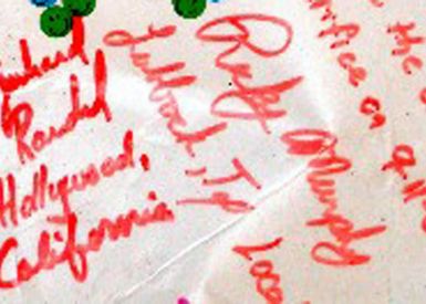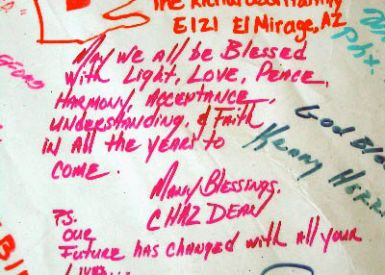 It was 101 degrees in the shade, but it was a dry heat. Right! We took in the desert sites as we shared driving the last stretch of highway to the West Coast. This would come to symbolize the mark of accomplishing our halfway goal. Here in LA, we had good friends that we were looking forward to seeing and would be able to stay with. We arrived just before closing time to meet our friend Mark Acetelli at his place of work, Chaz Dean Studio. We laid a few sections of the banner out in the parking lot for him, and his coworkers to sign.