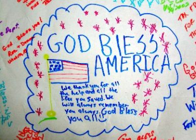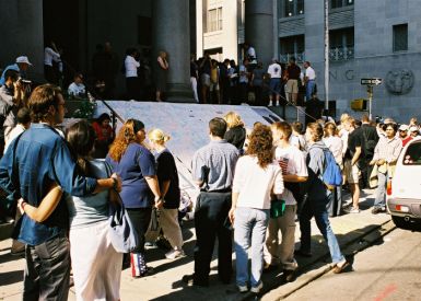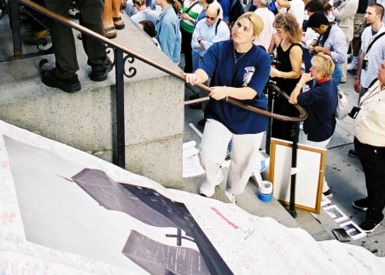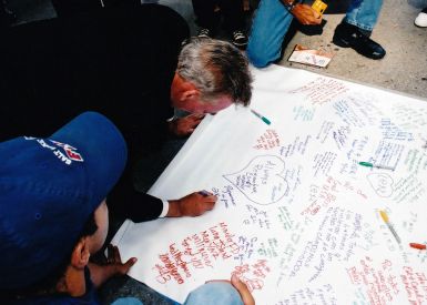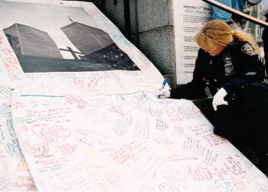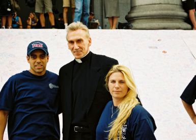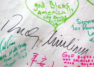 Family memorial services were being held at St Peters Church. Mayor Giuliani and Father Madigan came out to meet us, and sign the banner.