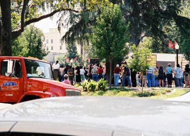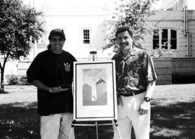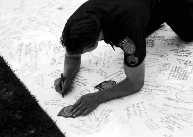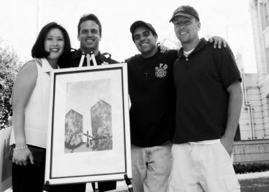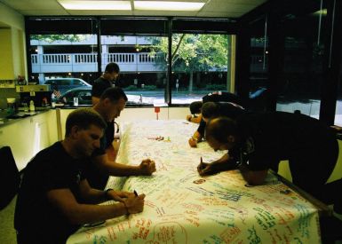 Our contact was Scott Yates, and he arranged for us to be at City Hall. He had also done something similar to what we were doing with the banner. He and family members rode their bikes across country as a fundraiser for 9/11. So he was more than understanding, and willing to help us in any way he could with our project. The banner was displayed outside along the front entrance, and the FD and PD were there to assist us. We stayed there until mid afternoon.