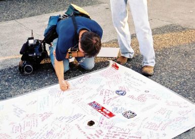 The FD was located on a very busy street along Puget Sound. The weather was beautiful, and there was still plenty of daylight before sunset. The area was filled with activity by locals and tourist. The FD greeted us along with the media, and we displayed all the banner sections out on the station driveway. They were eager to help, and most proud to have the banner here. It was at this point we realized how big the banner had become, and how far we traveled.