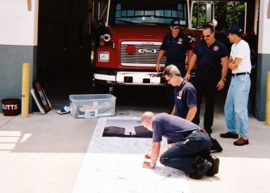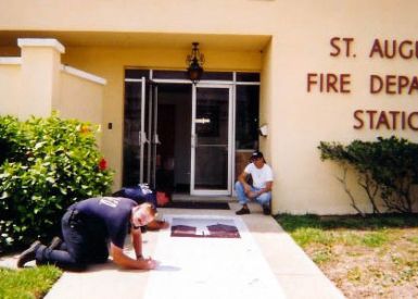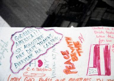 St Augustine and St Johns reconfirmed for us that the FD was good place to visit. We were able to sit and talk for many hours about what it is that these unique individuals do everyday. They shared with us their feelings and concerns about September 11th in much detail. They took deep thought into signing the banner, and donated one of the oldest and rarest FD patches to it. We left feeling very moved. We knew in our hearts what the banner was becoming about, and more clear what we had to do with it.